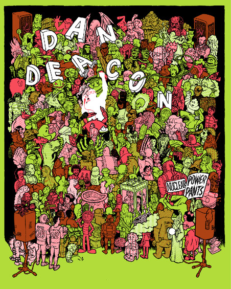 Post Typography (Bruce and Nolen from Double Dagger's design firm) has created an amazing poster for the upcoming Dan Deacon tour this fall! In addition to the amazing work, Dan Deacon is holding a contest to name each of the 243 cartoon characters drawn on the detailed work below!